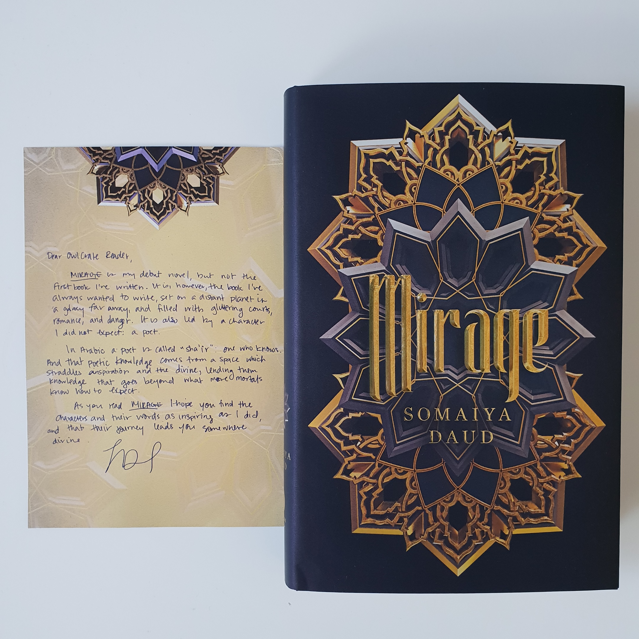 The book choice for this month is Mirage, by Somaiya Daud. It is an exclusive signed edition that contains a letter from the author.